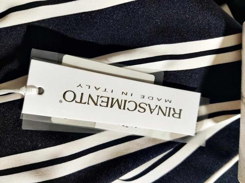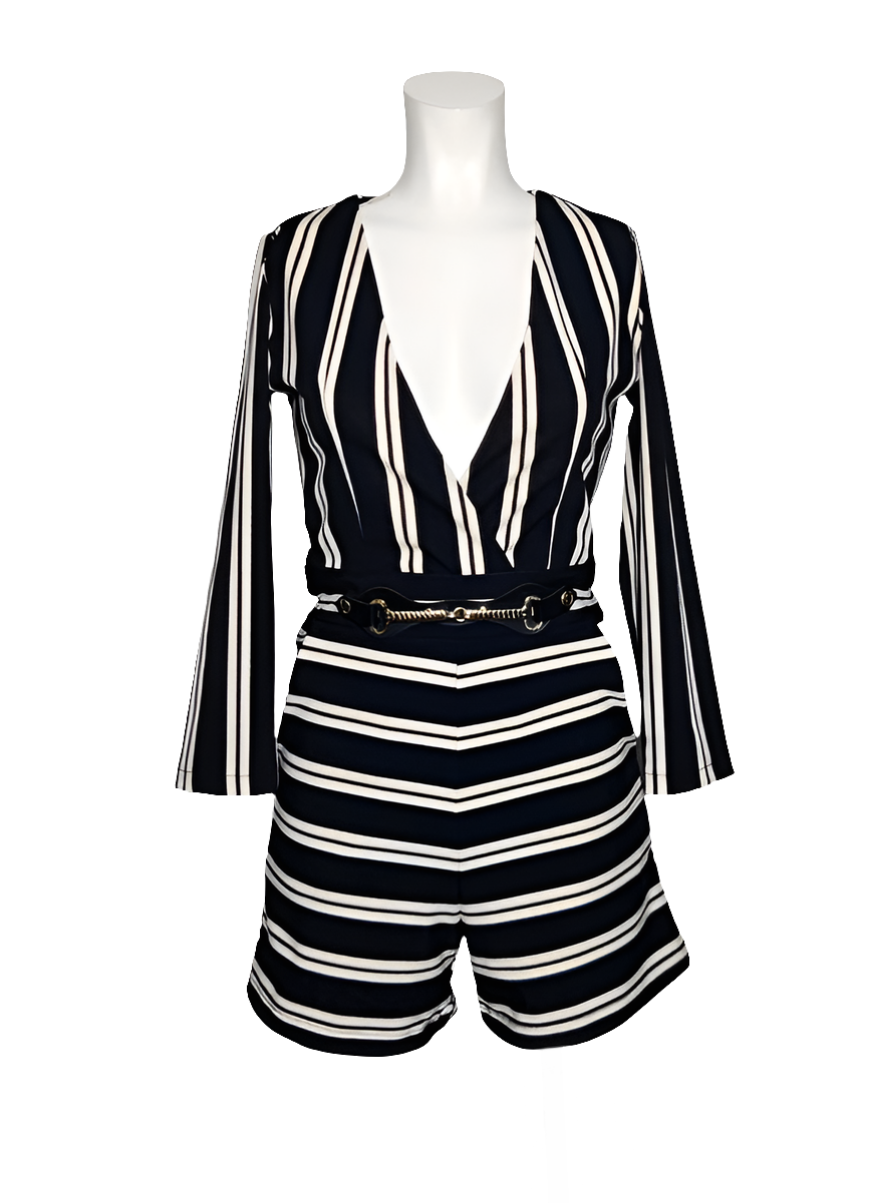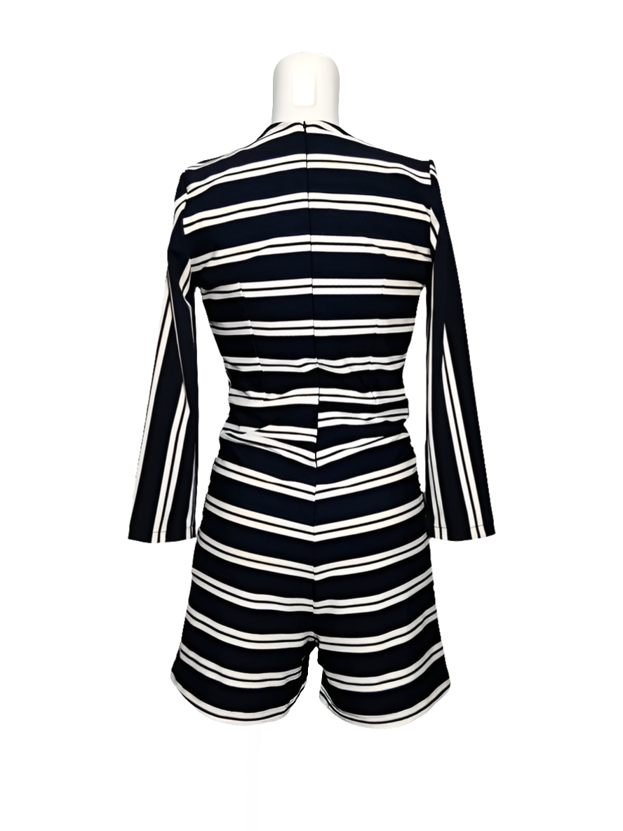 Diseño a rayas en blanco y negro: patrón vertical que estiliza la figura, con escote en V cruzado y rayas diagonales en el pecho para un efecto visual dinámico.
