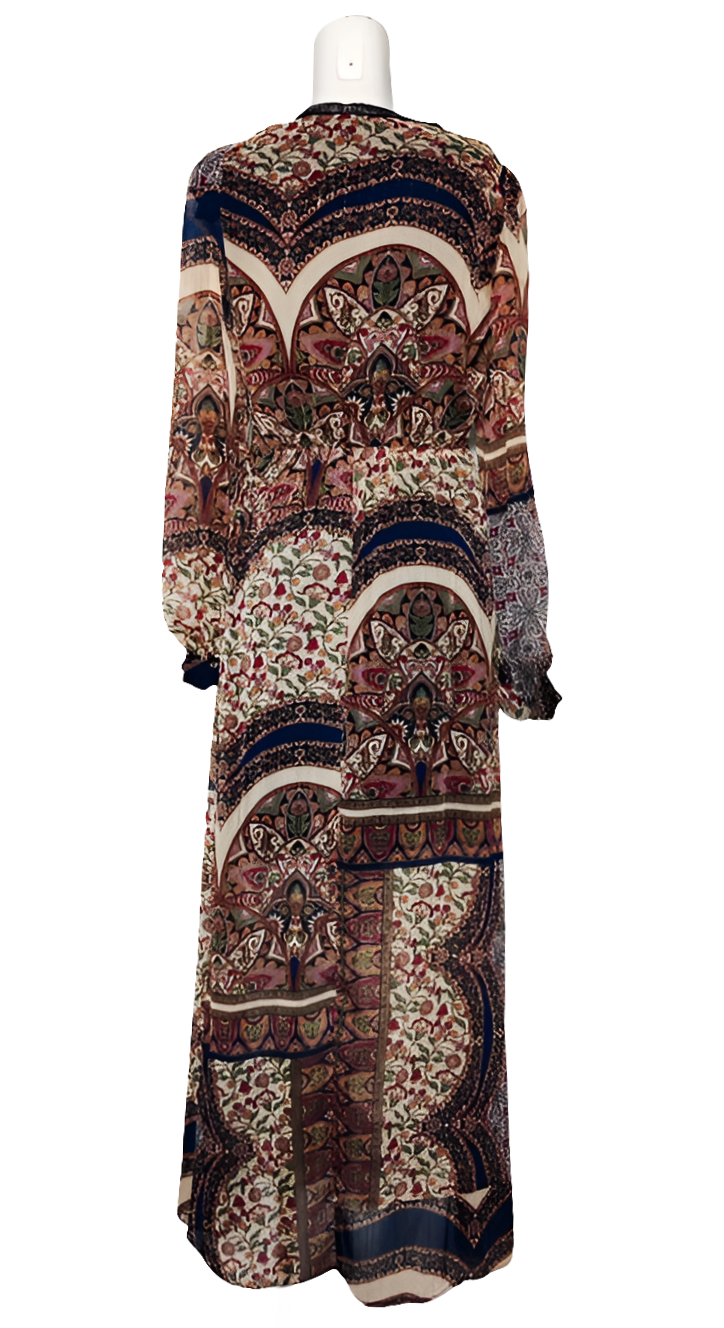 Estampado paisley multicolor: En tonos beige, marrón, rojo y azul marino para un efecto visual cálido y refinado