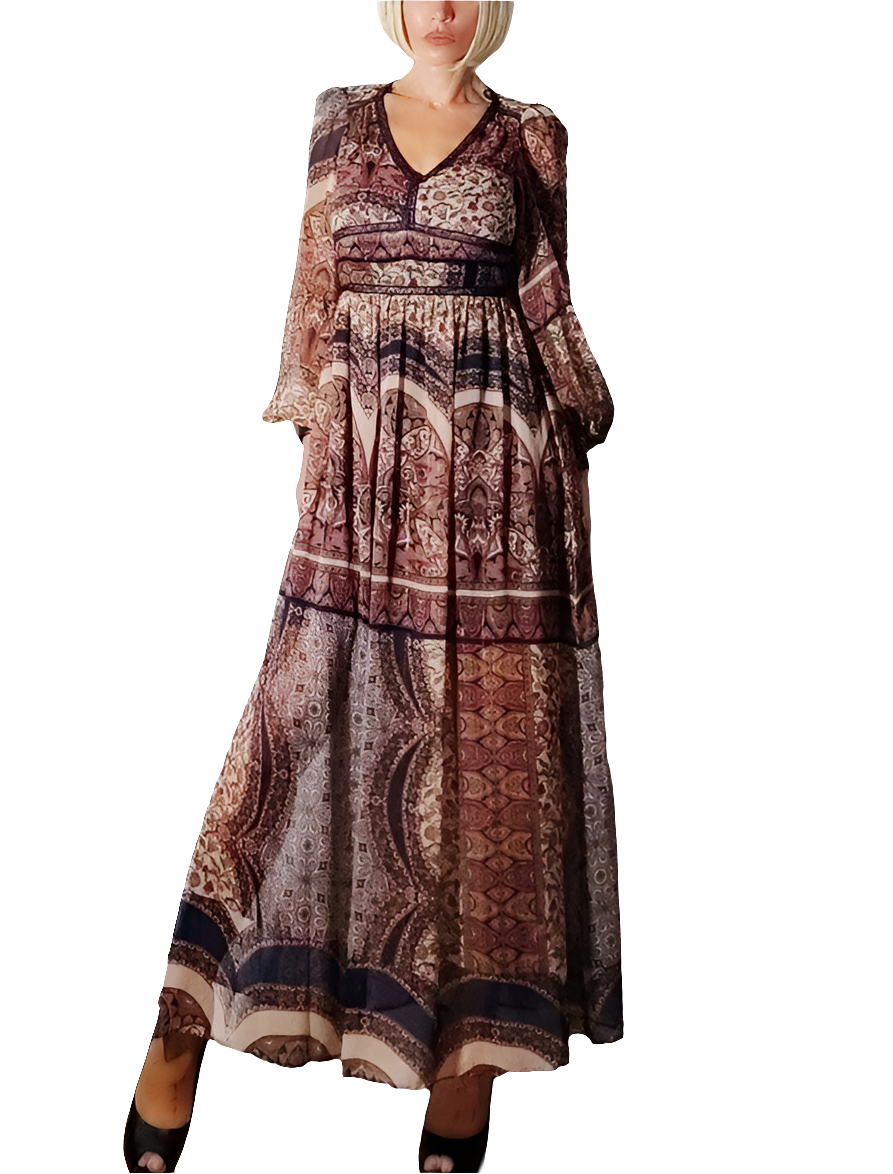 Este vestido largo de Naf Naf es una oda al estilo bohemio chic. Confeccionado en gasa ligera con un delicado estampado paisley en tonos cálidos y profundos, combina elegancia y fluidez en una prenda ideal para destacar en eventos semiformales o para elevar tu look diario.