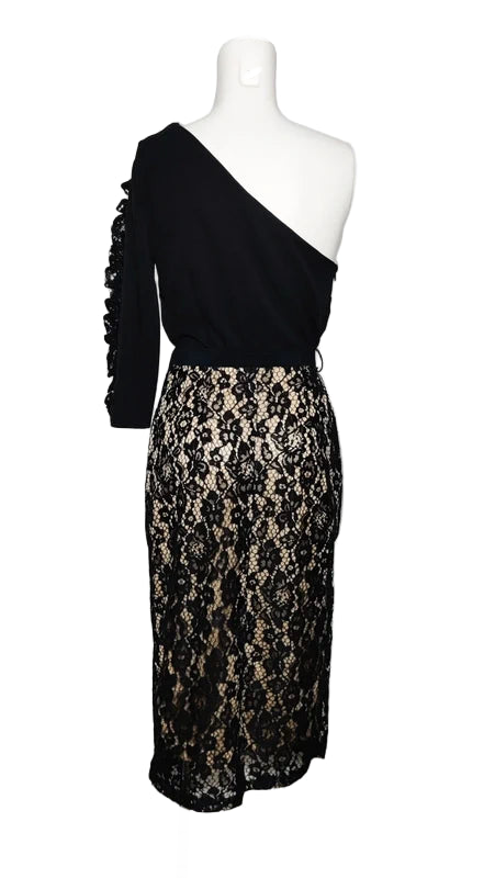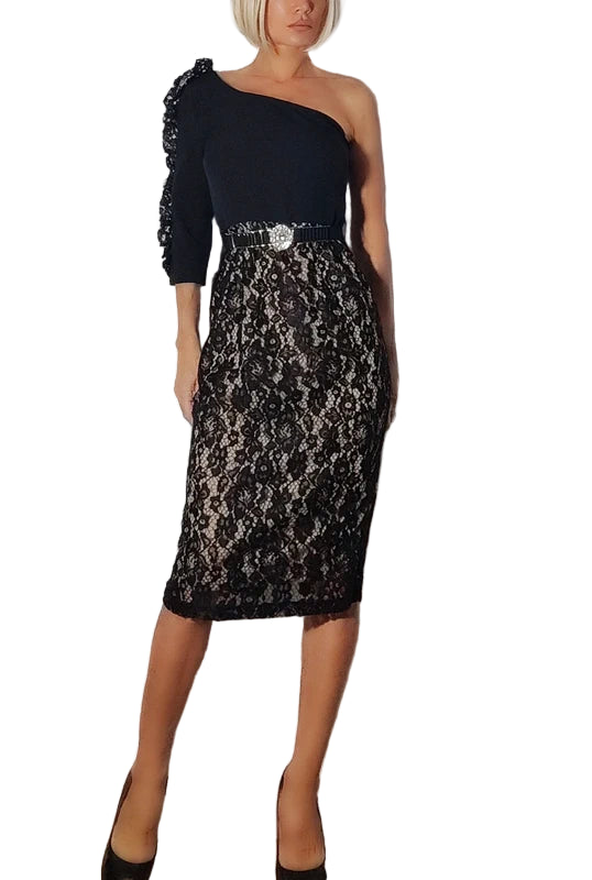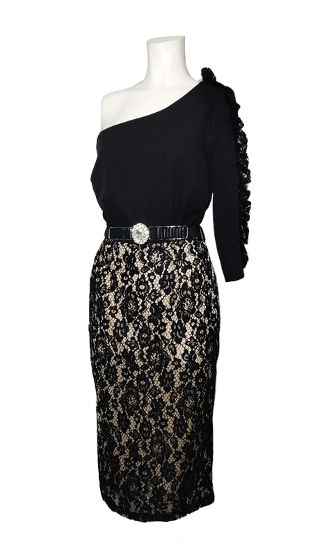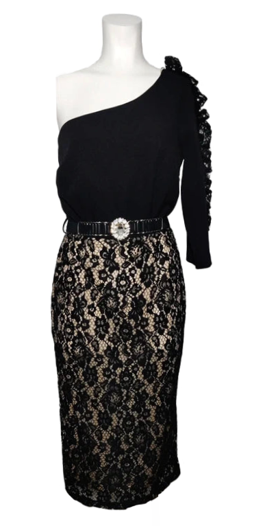 El hombro derecho luce un volante rizado de encaje floral negro, que se extiende en una manga tres cuartos (3/4), aportando textura y elegancia.