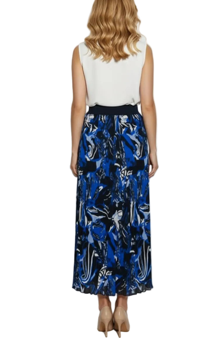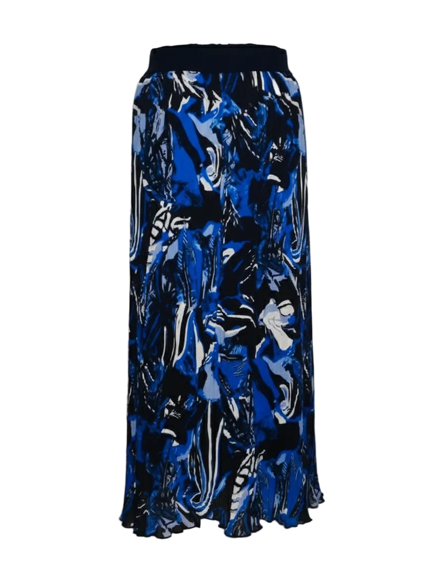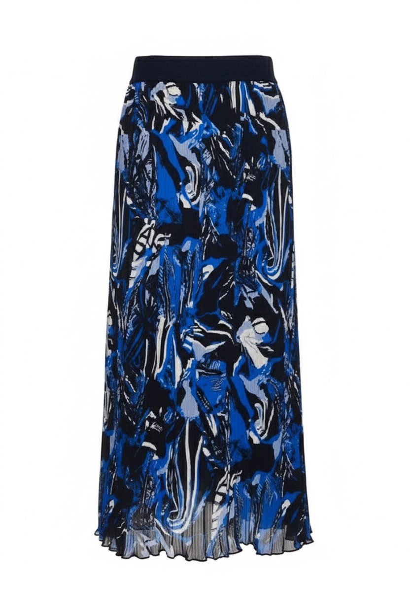 Estampado abstracto en tonos azul intenso, negro y blanco, con motivos ondulados tipo swirl que recuerdan pinceladas sobre un lienzo.