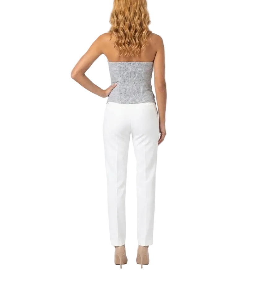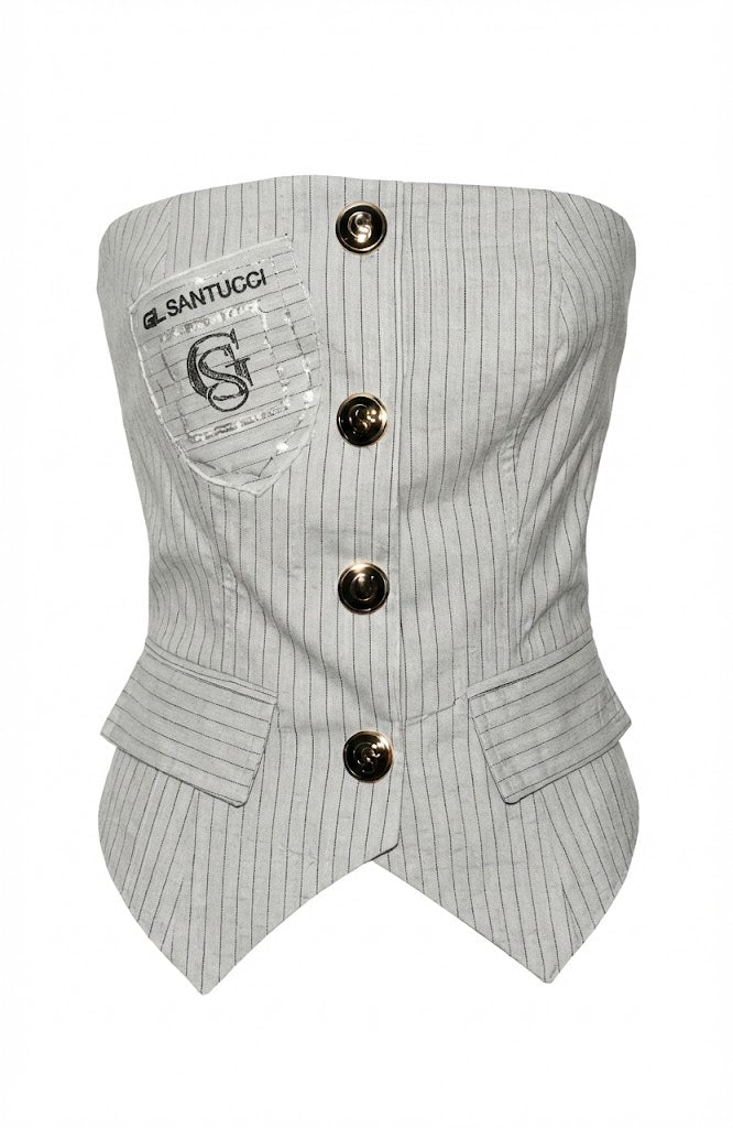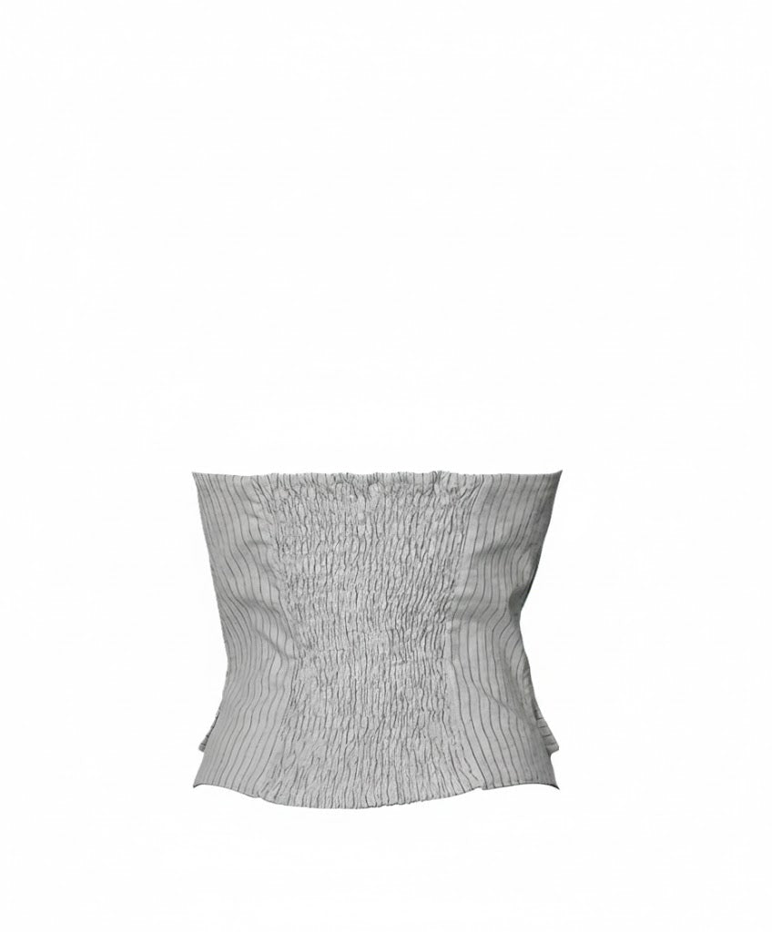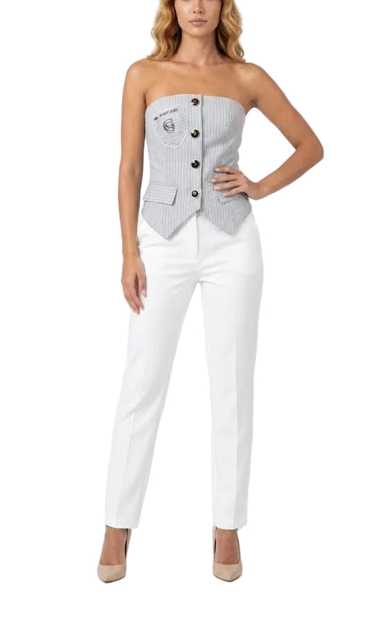 Eleva tus looks con este top corsé sin tirantes de Gil Santucci , una pieza de inspiración sastrera que combina sofisticación y diseño contemporáneo . Confeccionado en Italia con una cómoda mezcla de viscosa, presenta un estampado de raya diplomática en gris claro , ideal para un estilo urbano refinado.
