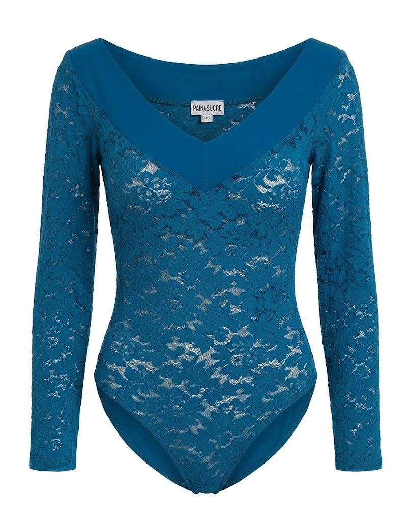 Añade un toque de sofisticación y feminidad a tu armario con este espectacular body azul de Pain de Sucre. Su diseño combina encaje floral intrincado en la parte superior con una base de tejido liso en la parte inferior, logrando un contraste delicado y refinado. Ideal para estilismos elegantes, tanto de día como de noche.
