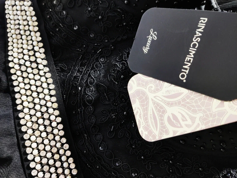 on encaje negro, pequeñas cuentas y cristales cosidos que aportan brillo sutil y textura bajo la luz.