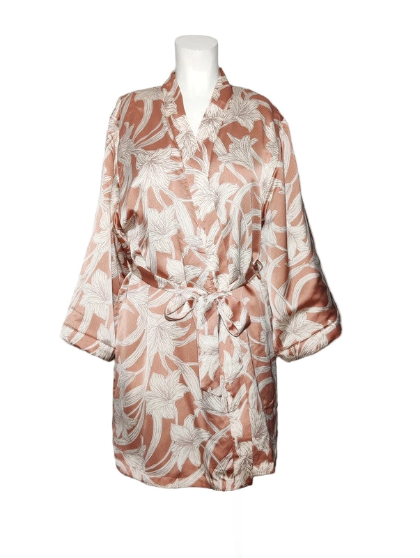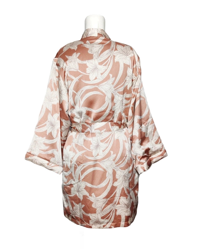 Descubre la bata satinada floral de Etam, una pieza que combina elegancia, confort y estilo atemporal. Diseñada en satén ligero con un delicado estampado de lirios en tonos crema sobre fondo rosa terracota, esta prenda aporta un aire romántico y sofisticado a tus momentos de relax.