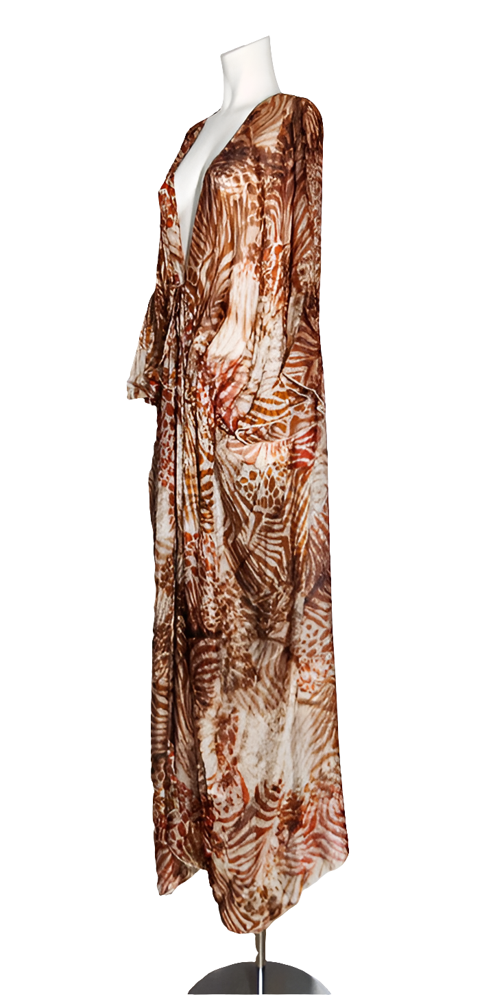 Eleva tus looks con este kimono largo GUESS Eryn , una prenda fluida y sofisticada que fusiona la ligereza de la seda con el estilo salvaje del animal print . Diseñado en una mezcla de tonos terracota, beige y marrón , su patrón de cebra estilizado le da un aire exótico y moderno, ideal para destacar en cualquier ocasión.